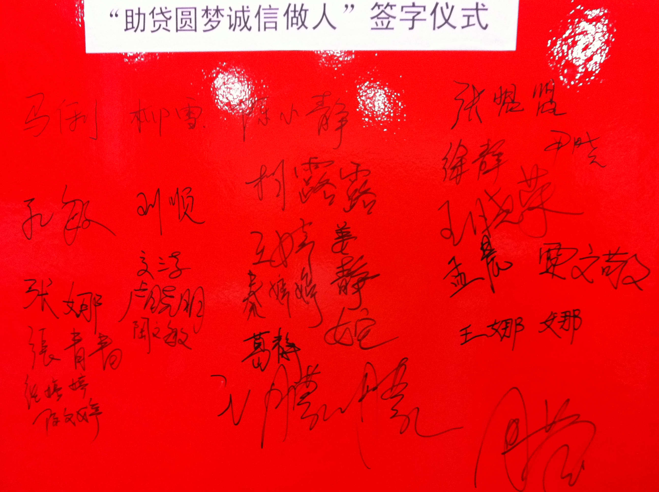 其次,学生代表09对外汉语班马俐同学发言,并带领全体申请国家助学贷款的学生郑重承诺按时还款,大家在还款承诺书上庄严地签上自己的名字,表达自己诚实守信的决心。