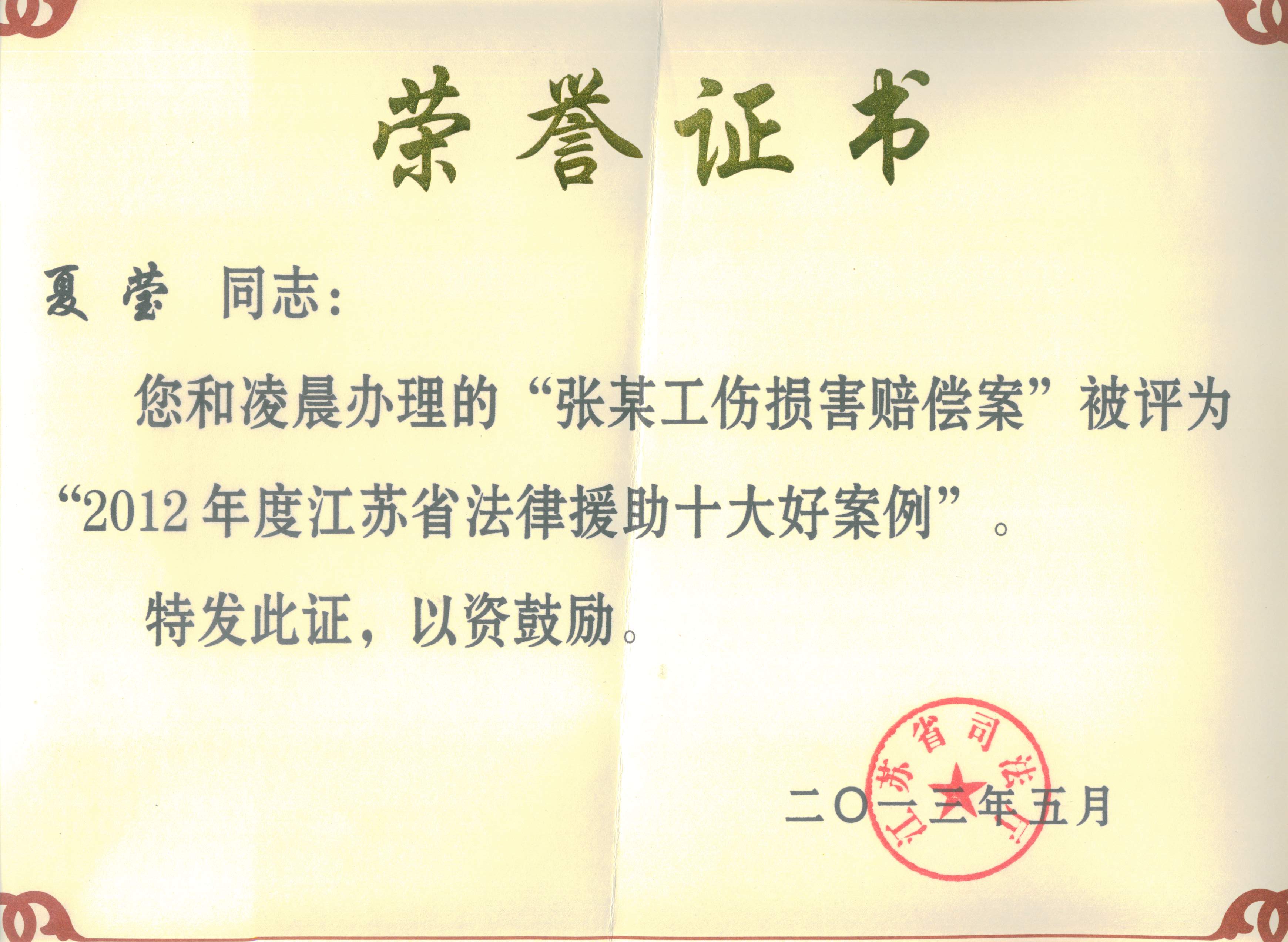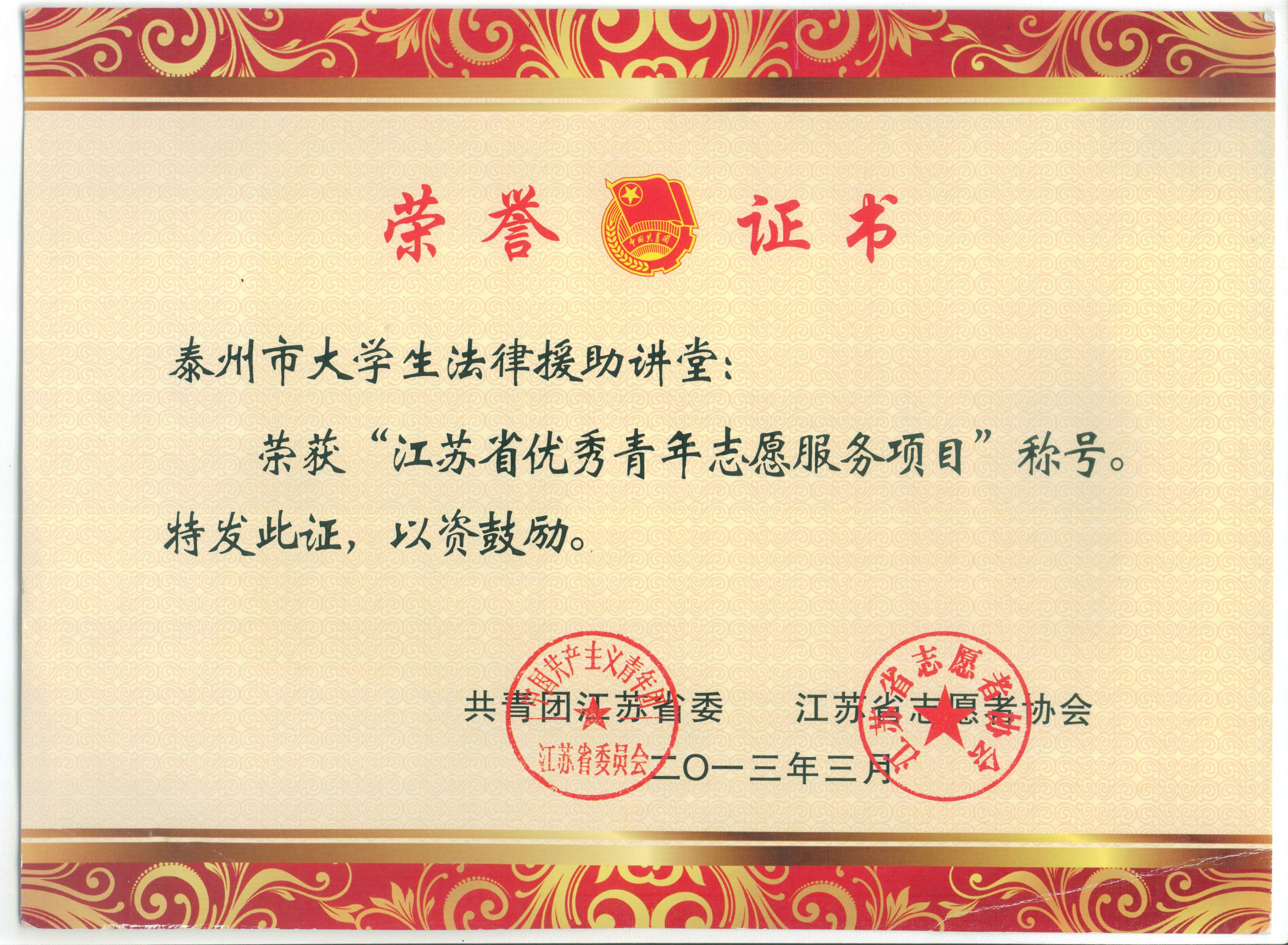 近日,我院法律援助又获两项省级表彰。一是我校与泰州市司法局联合创办的“泰州市大学生法律援助讲堂”荣获共青团江苏省委、江苏省志愿者协会“江苏省优秀青年志愿服务项目”称号。二是夏莹老师和凌晨老师共同办理的“张某工伤损害赔偿案”被评为江苏省司法厅“2012年度江苏省法律援助十大好案例”。