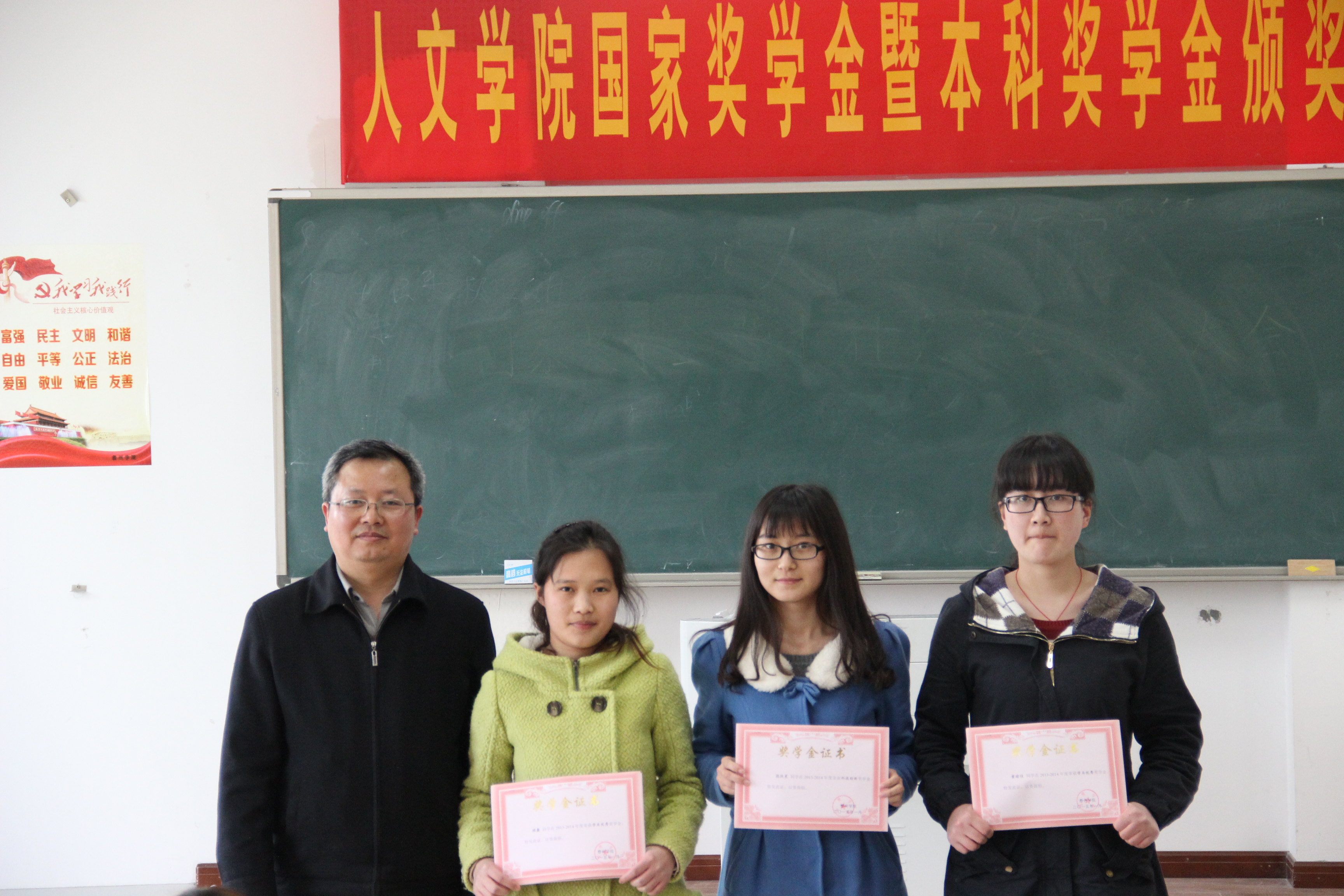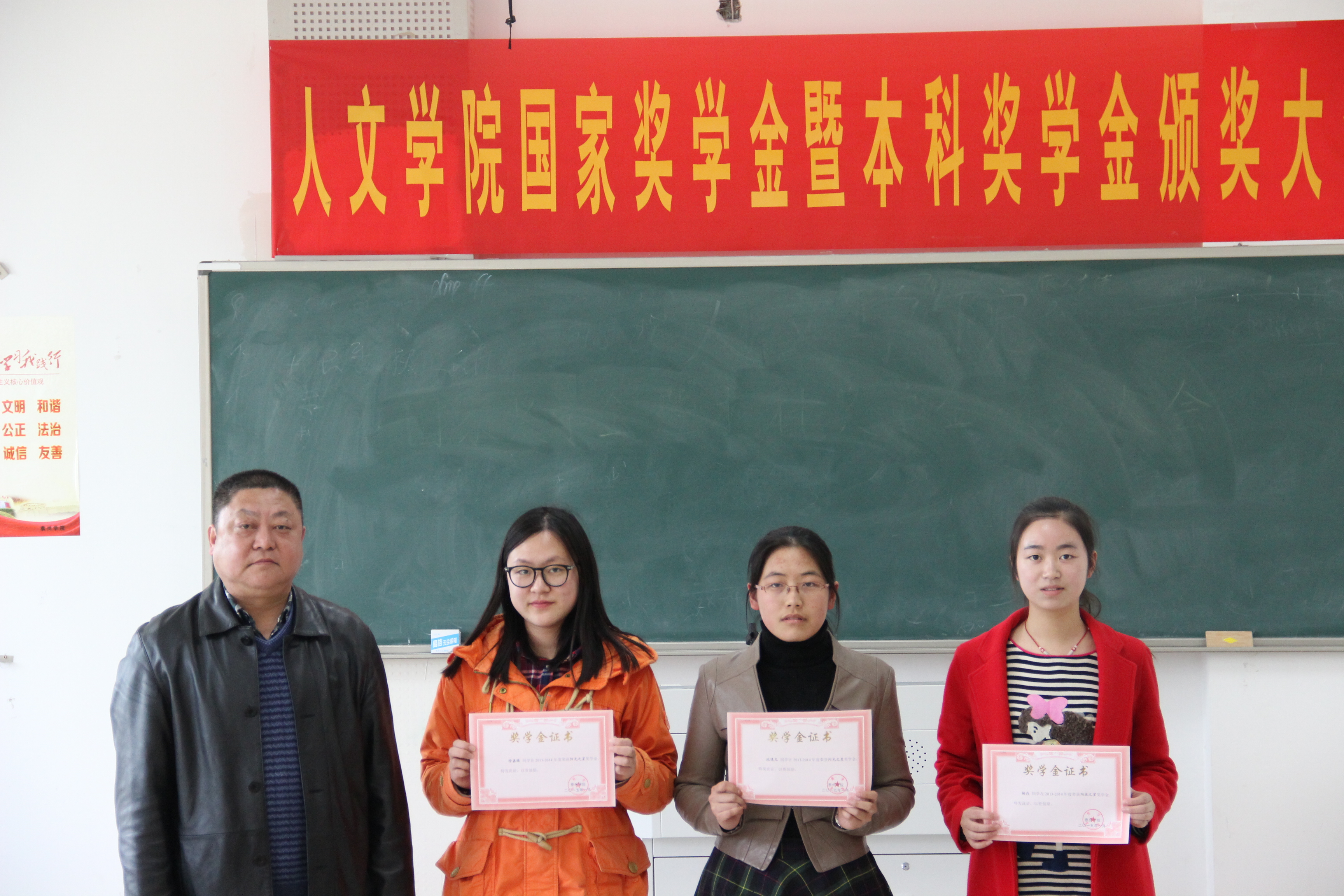4月10日下午,太阳集团tyc539macau在教学楼2108举行了国家奖学金暨本科奖学金颁奖仪式。出席仪式的有太阳集团tyc539macau院长李宪君、太阳集团tyc539macau党总支副书记孙爱斌、陈健彤老师以及13、14级汉语言文学全体学生。周建飞老师主持了本次颁奖仪式。