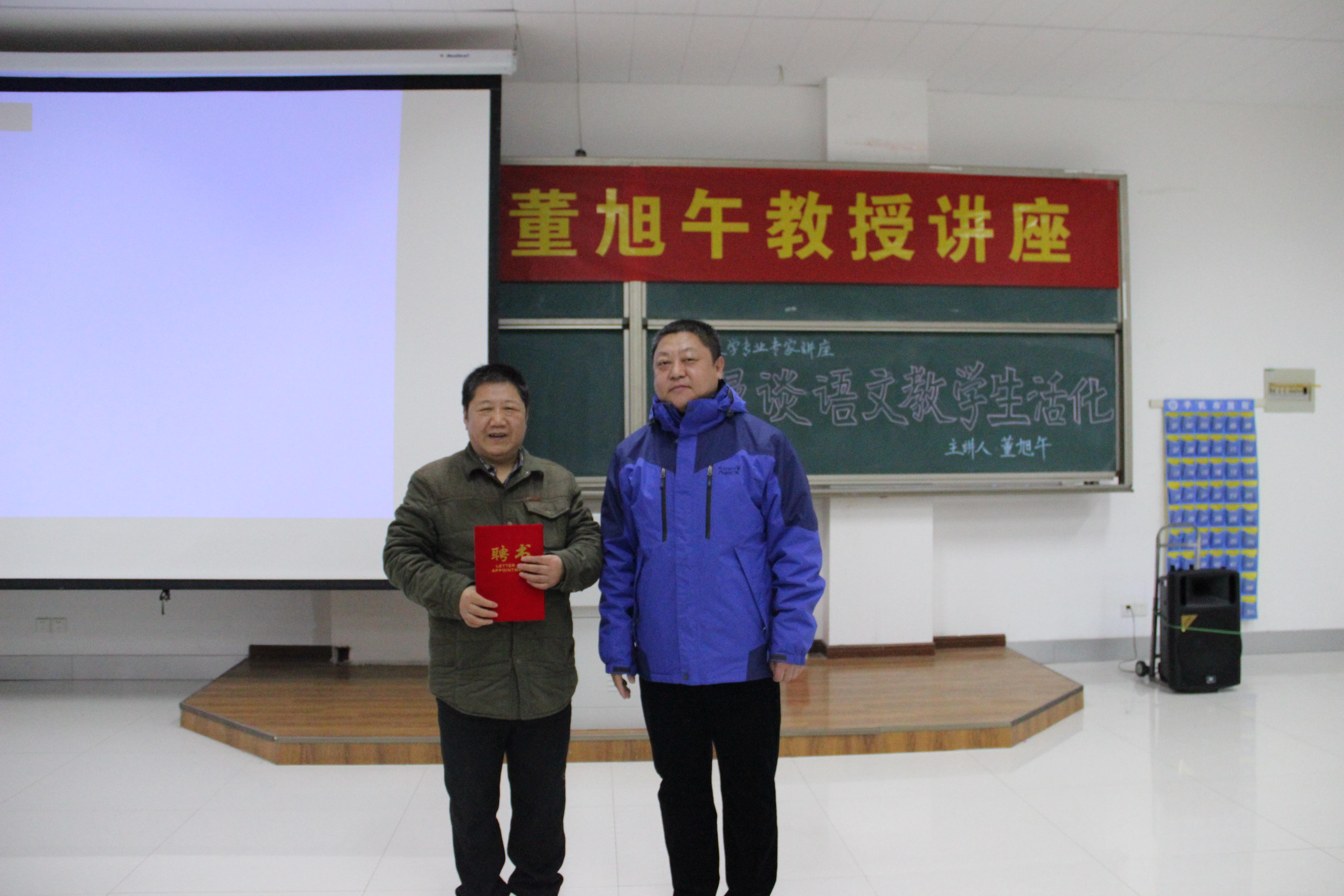 讲座伊始,董老师以他即将出版的新书引入主题。他认为语文课堂需要运用“一化六教”的模式,此“化”即生活化,教学的方式、方法、环境、体系等都是生活化的语文教学。随后,他详细的讲解了“一化六教”的具体内容,即教学生把语言历练当日子过、把据理品析当日子过、把自主思辨当日子过、把依文练写当日子过、把读世悟文和语文积累当日子过。通过列举朱自清的《绿》、老舍的《济南的春天》等例子,解析其中经典的词句,生动形象地指出了语文学习中表达能力的重要性。他还倡导对课文思想内涵的归真深察:杨绛先生的《老王》结尾处令人深思的“好香油”、“大鸡蛋”,在董教授的深入解读之下,给同学们带来启发与思考。