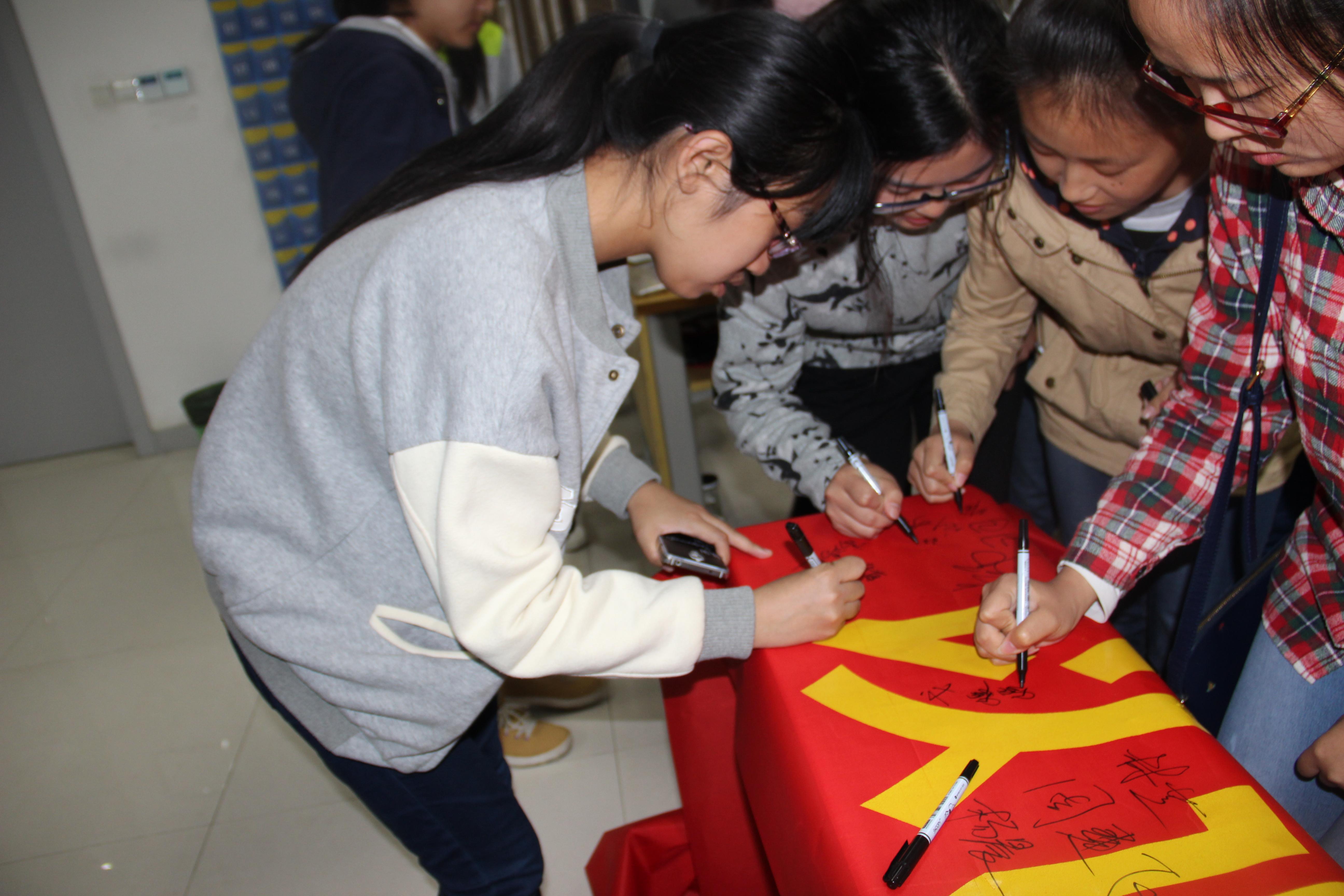 讲座结束后,管珂与同学们一起在“诚信为本、以诚待人、以诚相报”横幅上签名。
