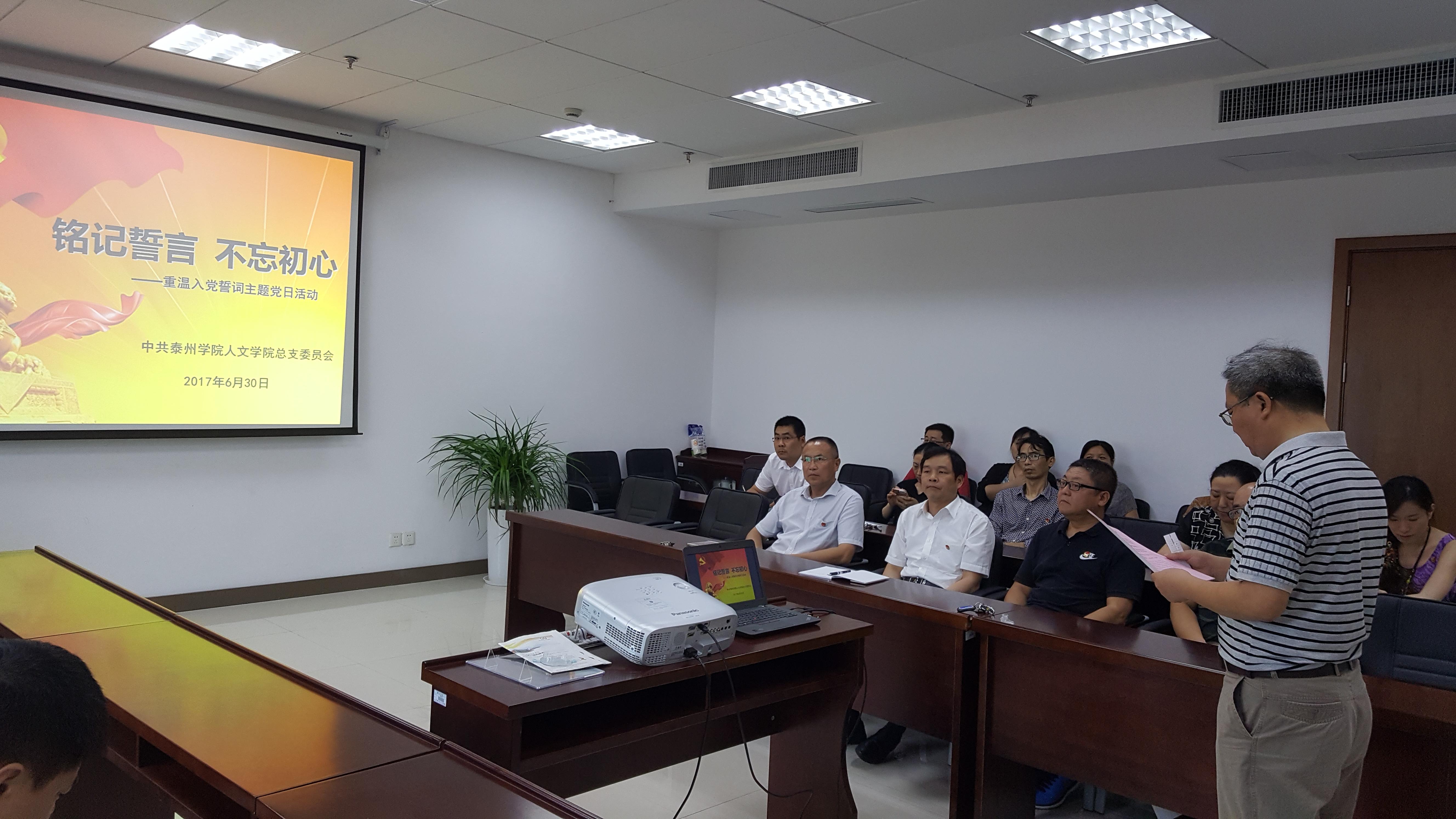 在中国共产党建党96周年来临之际,6月30日下午,太阳集团tyc539macau党总支在D1319举行了“铭记誓言,不忘初心”主题党日活动。本次活动由太阳集团tyc539macau党总支副书记孙爱斌主持,联系校领导周建超副校长,太阳集团tyc539macau、马克思主义学院全体党员教师参加了活动。