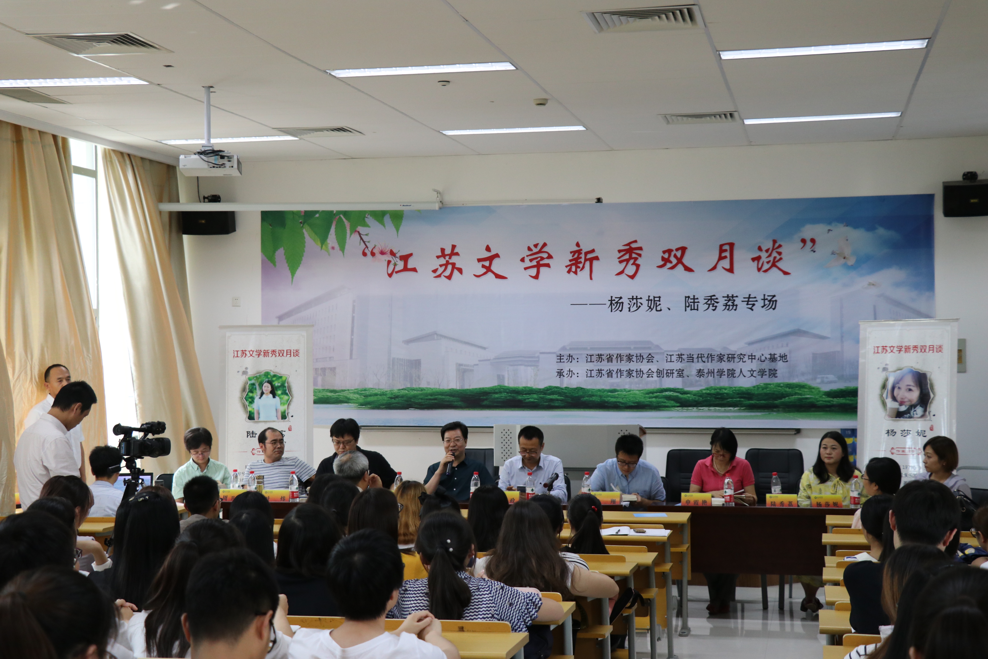 研讨会期间,江苏省作家协会、江苏当代作家研究中心基地主办,江苏省作家协会创研室和我院承办了“‘江苏文学新秀双月谈’——杨莎妮、陆秀荔专场”活动。两位作家热情地分享了自己的创作经历与体验,5位文学评论家分别针对两位作家的作品提出了自己的见解,并在互动环节,对同学提出的思考与困惑,一一作了回应,指点迷津。“江苏文学新秀双月谈”活动,首批主要研究和关注对象为十位江苏文学新秀,采取“2+1+5”(2位青年作家,1位主持人,5位青年批评家)的对谈模式,旨在推动江苏文学新人成长,展示文学新秀写作风貌,为江苏文学后继发展培养有力新生力量,该活动每两个月举行一次,之前已在南京师范大学、扬州大学等高校成功举办过3场。