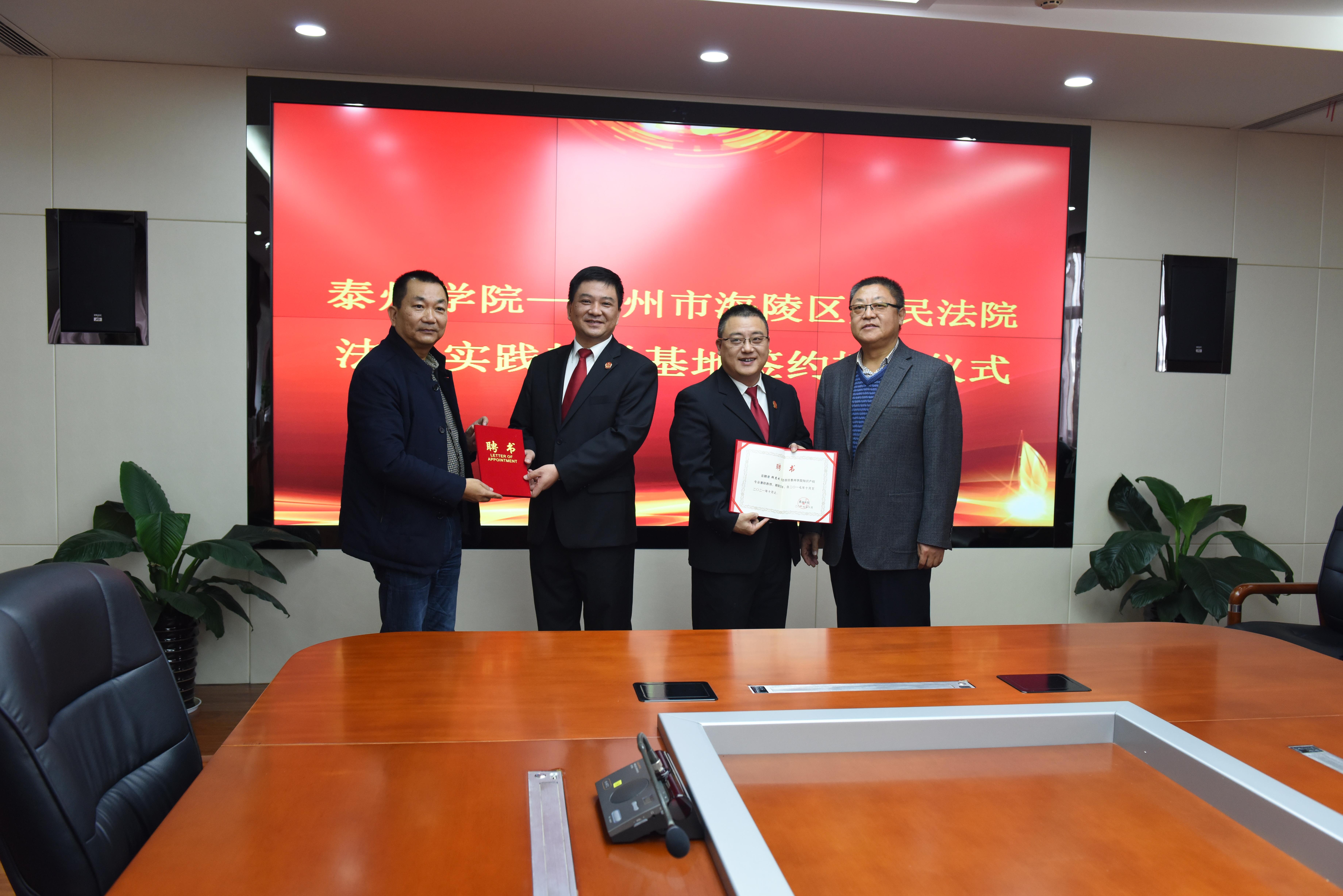 本周,我院先后在泰州高新区法院、海陵区法院举行了实践教学基地签约揭牌仪式,并聘请了4位法官为知识产权专业兼职教授。我院院长李宪君教授、高新区法院院长胡欣荣法官、海陵区法院副院长顾国华法官、专业教师张为东老师及新聘请的兼职教授参加了仪式。