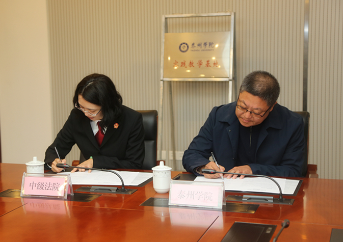 11月17日下午,我校与泰州市中级人民法院合作办学签字仪式在中级人民法院会议室隆重举行,泰州中院党组副书记、副院长纪阿林,党组成员、副院长冯毅,党组成员、政治部主任刘瑛,知识产权庭庭长蔡勇,我校教务处副处长杨林,太阳集团tyc539macau院长、党总支书记李宪君,法学教师张为东等出席签约仪式。