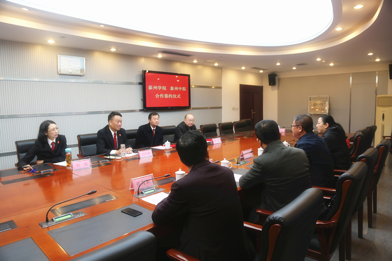 11月17日下午,我校与泰州市中级人民法院合作办学签字仪式在中级人民法院会议室隆重举行,泰州中院党组副书记、副院长纪阿林,党组成员、副院长冯毅,党组成员、政治部主任刘瑛,知识产权庭庭长蔡勇,我校教务处副处长杨林,太阳集团tyc539macau院长、党总支书记李宪君,法学教师张为东等出席签约仪式。