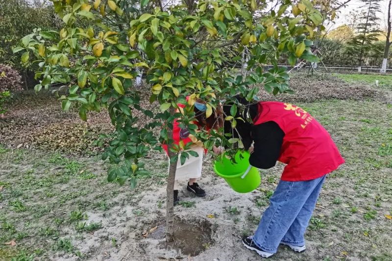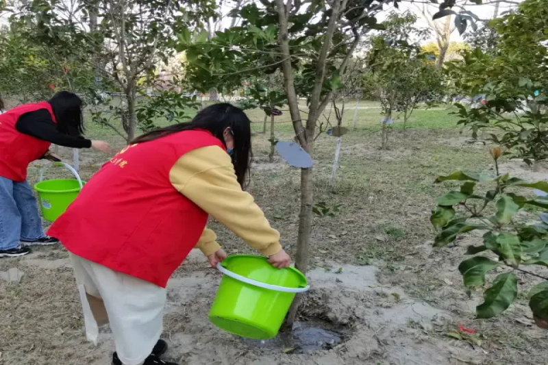 实践部部长王天伊带领若干名志愿者在行政楼下集合,安排志愿者们两两组队、分工合作,从运水到浇灌树苗,有条不紊。班树周围的泥土得到了水的滋润,校园环境也因此更加宜人。荟萃林的班树在水的倾情浇灌后显得生机勃勃。