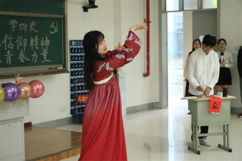 以红色实践汲取信仰精神,在第二板块“还看今朝”中,19汉师2班马姝琪带领团队分享了她们亲身考察苏川桂粤黔等七地红色精神探访的成果:从广州起义纪念馆到宝应革命烈士纪念馆,从红船精神到抗疫中的团结奉献精神……实践团队回首过去,还看今日,将薪火相传的红色精神在声情并茂的讲述中传递给青年。在舞蹈和书法的结合表演《袖舞丹青》和20级同学的军训采访视频中,团日活动将四个自信与红色革命精神给予同学们潜移默化地灌输。