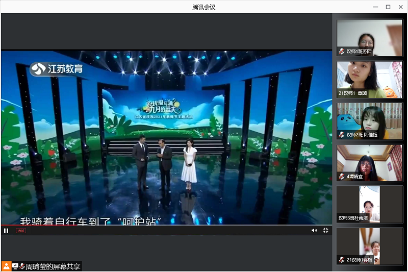 9月9日晚19点50分,太阳集团tyc539macau全体师范专业学生在各年级辅导员的分别主持下,利用腾讯会议平台在线收看江苏教育频道《“祝福写满九月的蓝天”——2021年江苏省庆祝教师节主题活动》,作为师范专业学生“开学第一课”活动。