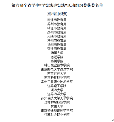 近日,江苏省教育厅公布了第六届全省学生“学宪法讲宪法”活动省级决赛结果,根据“学宪法讲宪法”活动开展情况,特别是“宪法卫士”2021 年行动计划参与情况,我校获第六届全省学生“学宪法讲宪法”活动杰出组织奖。