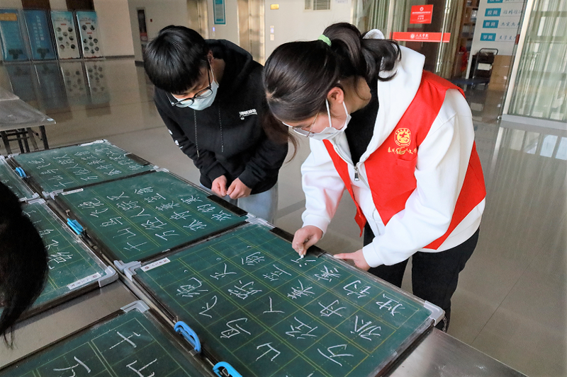 粉墨传情,战“疫”致学。张雅欣同学组织开展粉笔字训练,确保疫情期间学习不放松,为师范生基本功“蓄力充电”。在党员志愿者的耐心指导下,同学们对于笔画考究和偏旁把握都更上一层楼,一撇一捺,尽显师范风采。