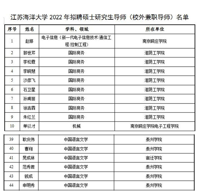 近日,江苏海洋大学研究生院公示了该校2022年新聘兼职硕导名单,我院曹翔、范秀君、申明秀、耿庆伟、钱成被聘为中文一级学科学术型硕士生导师。同时,该校文法学院与我院达成联合培养协议,以我院教师名义招生的学术型硕士,将在江苏海洋大学完成第一年基础课学习后,转至我院进行后两年的培养工作。