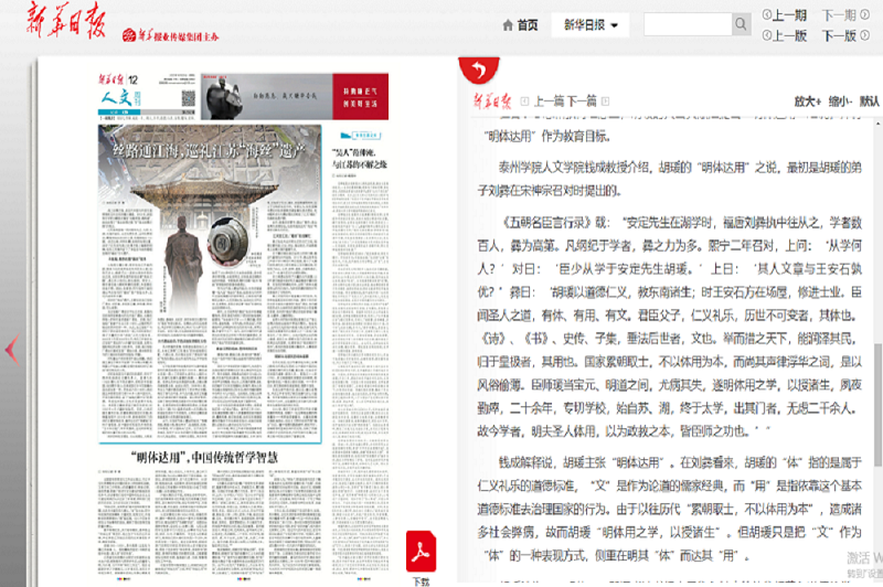 10月20日,《新华日报·人文周刊》围绕习近平文化思想,刊登了《“明体达用”,中国传统哲学智慧》专文。文中,刊载了我院钱成教授系统阐释胡瑗“明体达用”思想的专题采访内容。