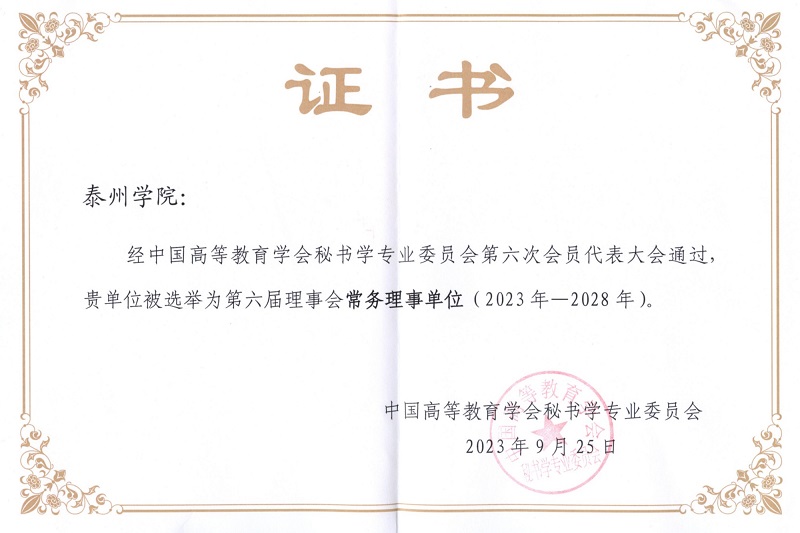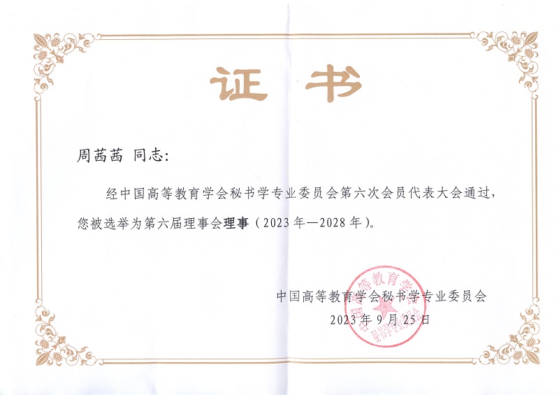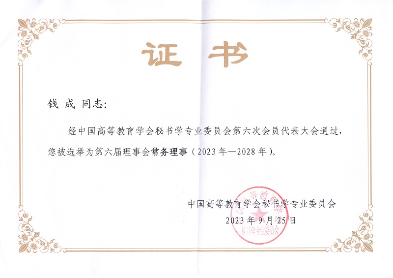 近日,中国高等教育学会秘书学专业委员会第六次会员代表大会在北京召开。经过大会严格的评审和投票程序,我校成功当选委员会常务理事单位,我院钱成教授当选常务理事,周茜茜老师当选理事。