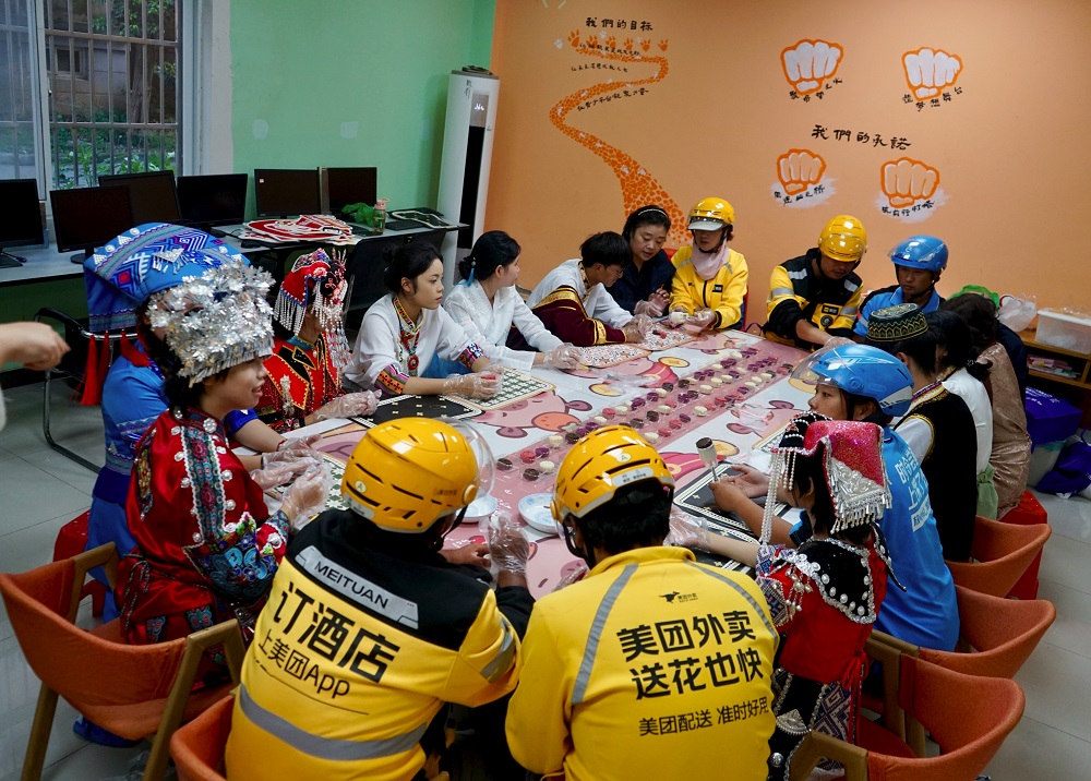 演出结束后,学生代表与社会各界新就业群体共同做月饼,唠家常。