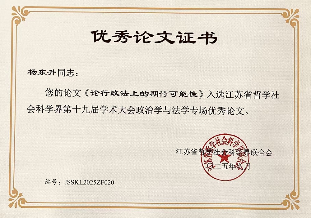 2025年9月26日,由省委宣传部、省社科联主办,苏州大学承办的省社科界第十九届学术大会政治学与法学专场在苏州举行。来自全省高校、科研机构等200多位专家学者,围绕“发展全过程人民民主,推进法治江苏建设”主题,研讨理论热点、跟踪实践前沿、开展学术交流。杨东升教授的参会论文《论行政法上的期待可能性》入选江苏省哲学社会科学界第十九届学术大会政治学与法学专场优秀论文。