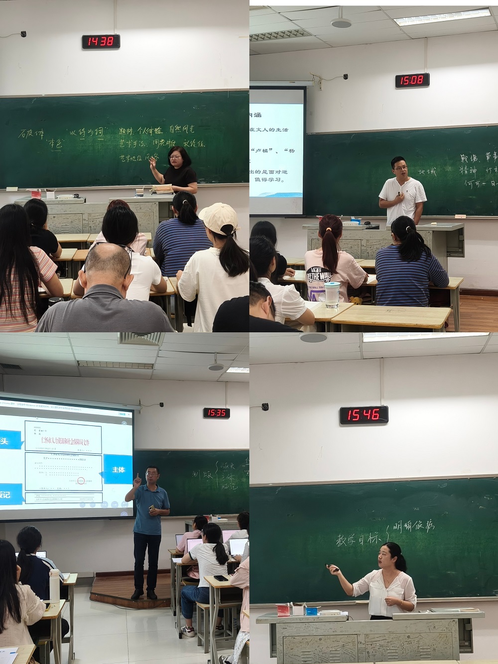 本次示范课邀请贺闱、韩元、周建飞、徐晶晶四位教师分别授课,四位骨干教师呈现了特色鲜明的课堂:贺闱老师以苏轼词风为轴,精辟剖析“以诗为词”的“破体”实践及其风格的壮阔多样性,展现古典文学深厚魅力;韩元老师聚焦古诗意象与意象群,通过概念阐释、课堂实践与综合解析,多维解读诗歌赏析技法;周建飞老师以党政机关公文格式为核心,通过师生双向互动,引导学生在认知与实操中掌握规范;徐晶晶老师立足中学语文课程教学论,强调教学目标的设定需依据明确、表述精准、素质导向鲜明,并融入AI辅助教学前瞻视野。