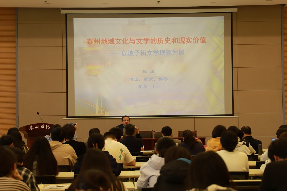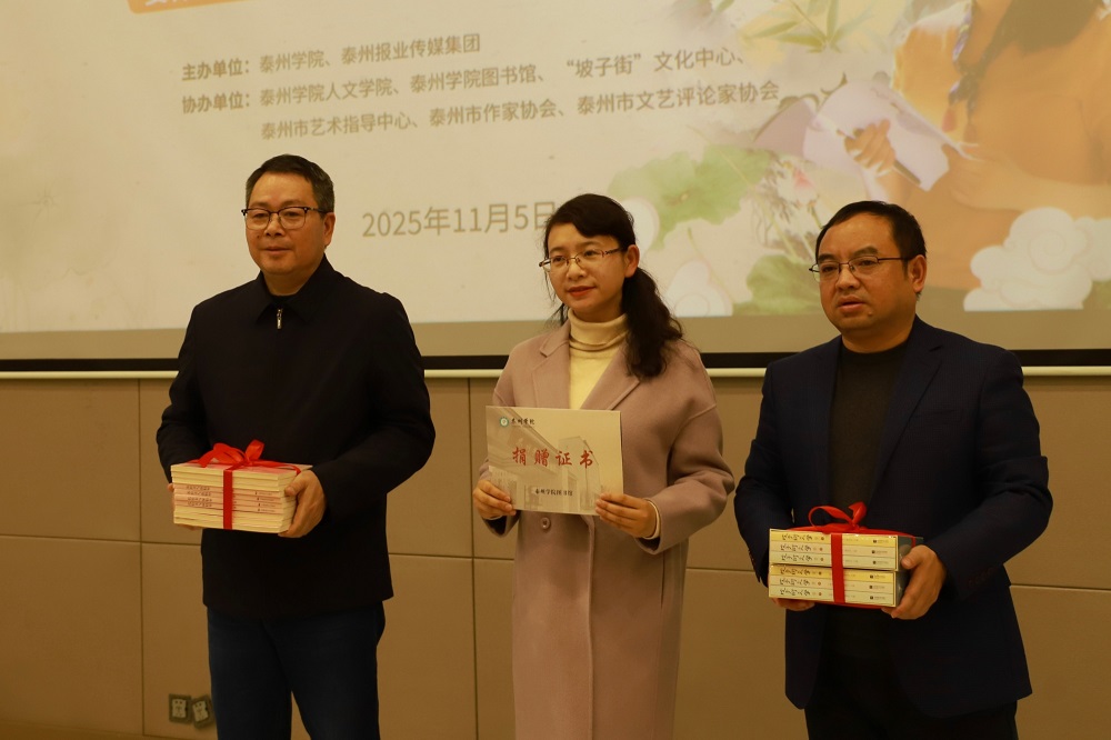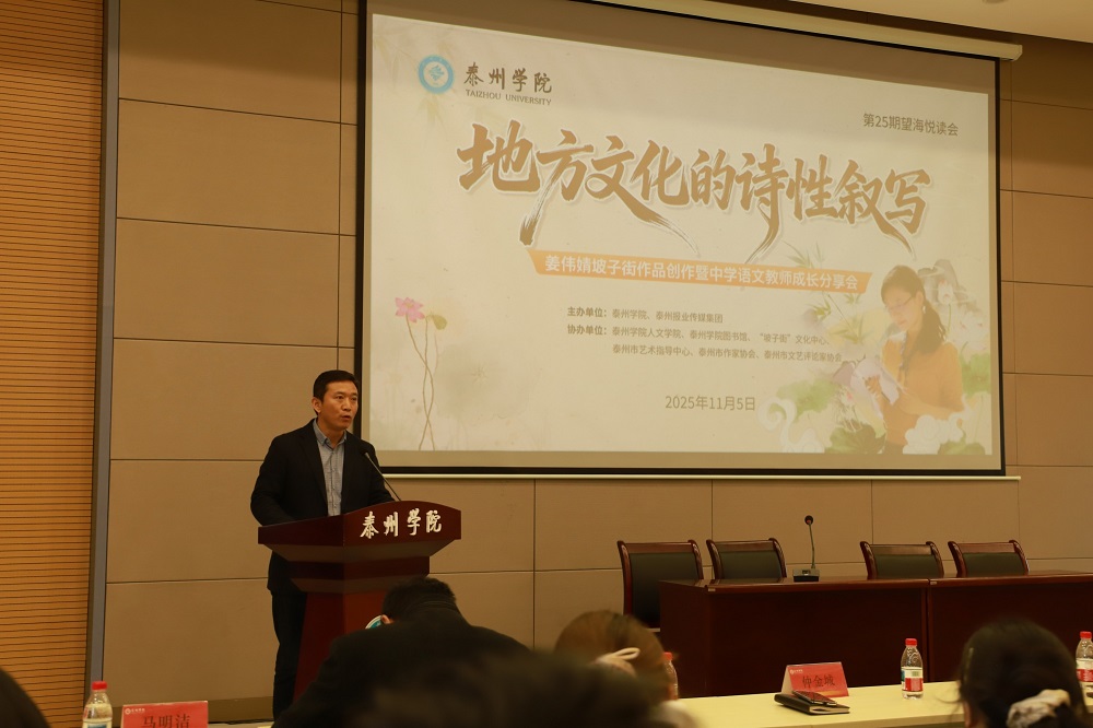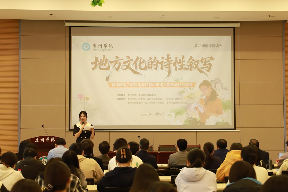 11月5日下午,“地方文化的诗性叙写——姜伟婧坡子街作品创作暨中学语文教师成长分享会”在我校图书馆胡瑗讲堂举行。此次活动由我校与泰州报业传媒集团联合主办,太阳集团tyc539macau、校图书馆、“坡子街”文化中心、泰州市艺术指导中心等共同承办,旨在搭建文学创作与教学实践交流平台,传承弘扬地方文化,共话中学语文教师成长,赋能师范生职业发展。泰州报业传媒集团党委委员、副社长苏元华,泰州市文联艺术指导中心主任周卫彬,“坡子街”文化中心编辑部主任李明官、运营部副主任仲金城,泰州市田家炳实验中学语文教师姜伟婧,校图书馆馆长李中明,太阳集团tyc539macau院长钱成以及师生代表等共140人参加活动。