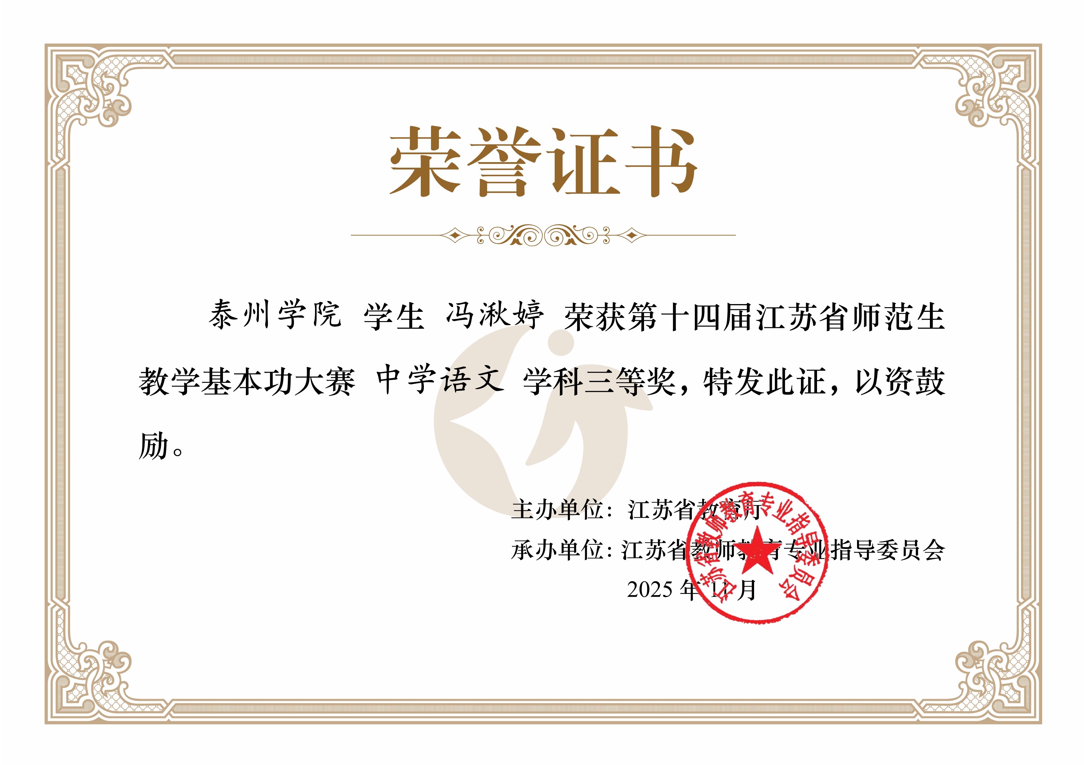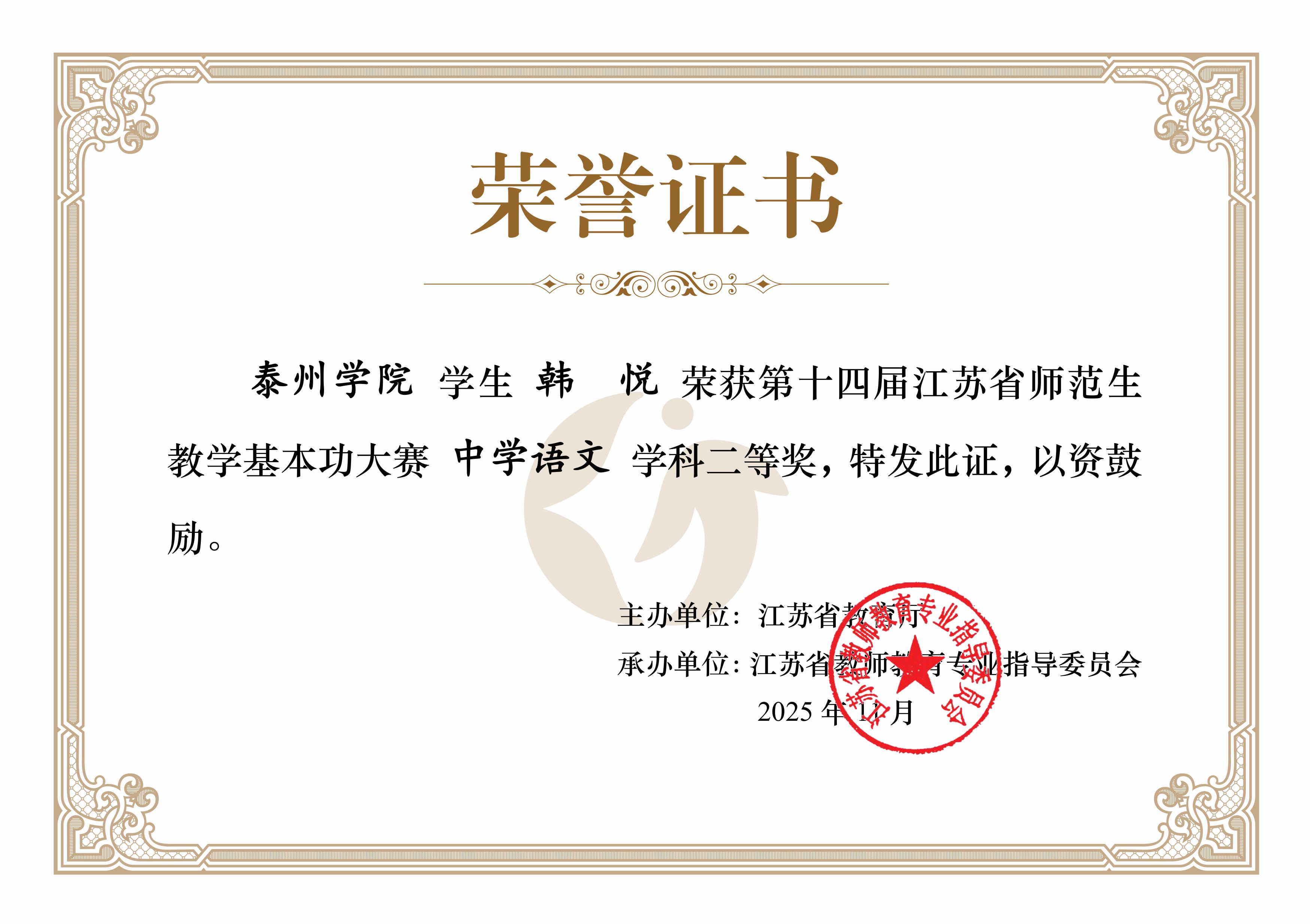 近日,江苏省第十四届师范生教学基本功大赛获奖名单正式公布。我院学子在中学语文组比赛中表现优异,共斩获一等奖1名、二等奖2名、三等奖2名,获奖人数与获奖名次较去年实现新提升、新跨越,呈现出持续突破的良好势头。