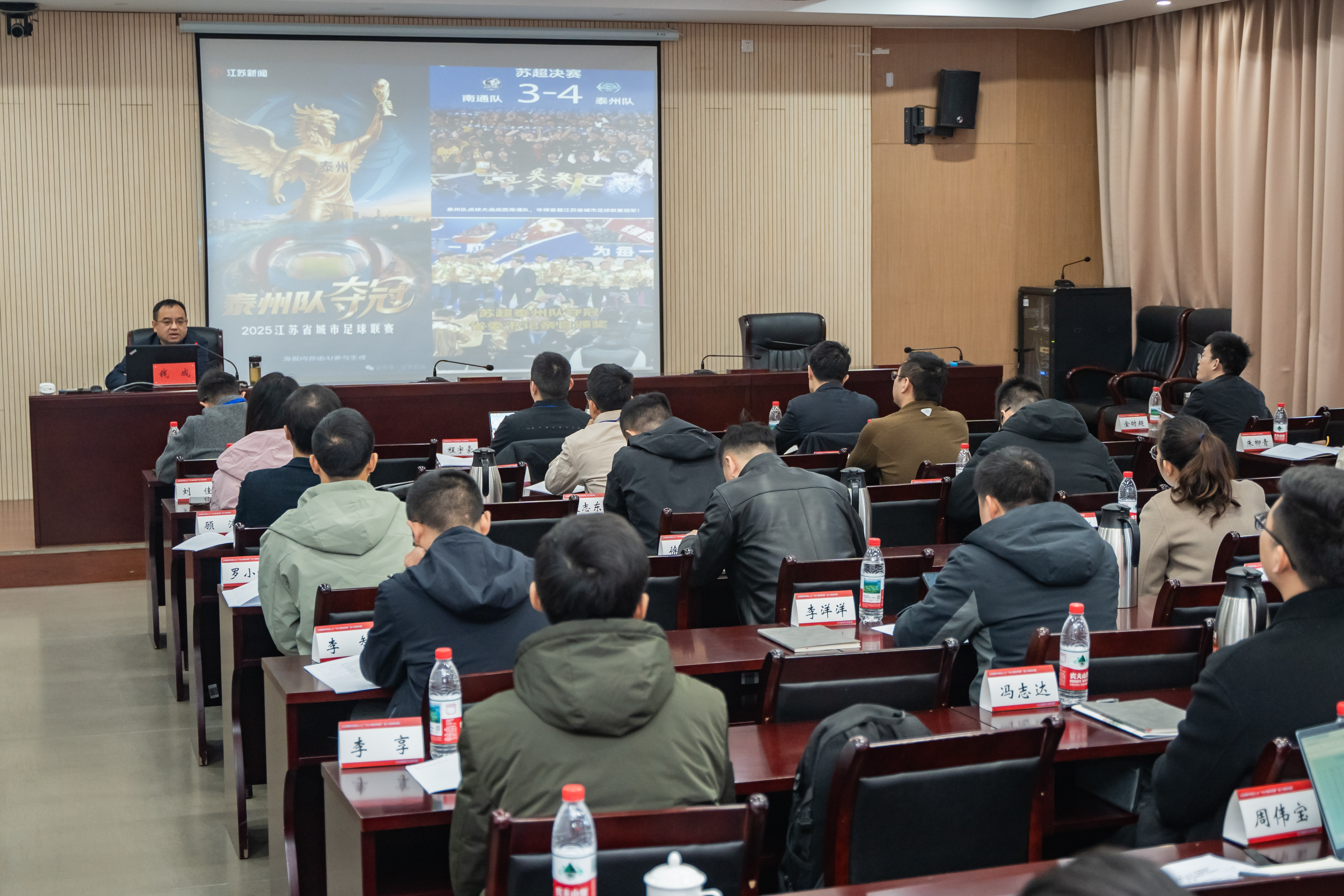 开班典礼后,我院钱成教授应邀为培训班作首场讲座。钱成结合近期“苏超”联赛,以“永远坚持‘三个不相信’”为题,概述了江苏和泰州发展现状、江苏和泰州地域历史文化,并重点就泰州队勇夺首届“苏超”冠军所展示出来的城市人文精神进行了说明。他还系统讲述了“习近平文化思想”体系中“明体达用”的由来和现代阐释。