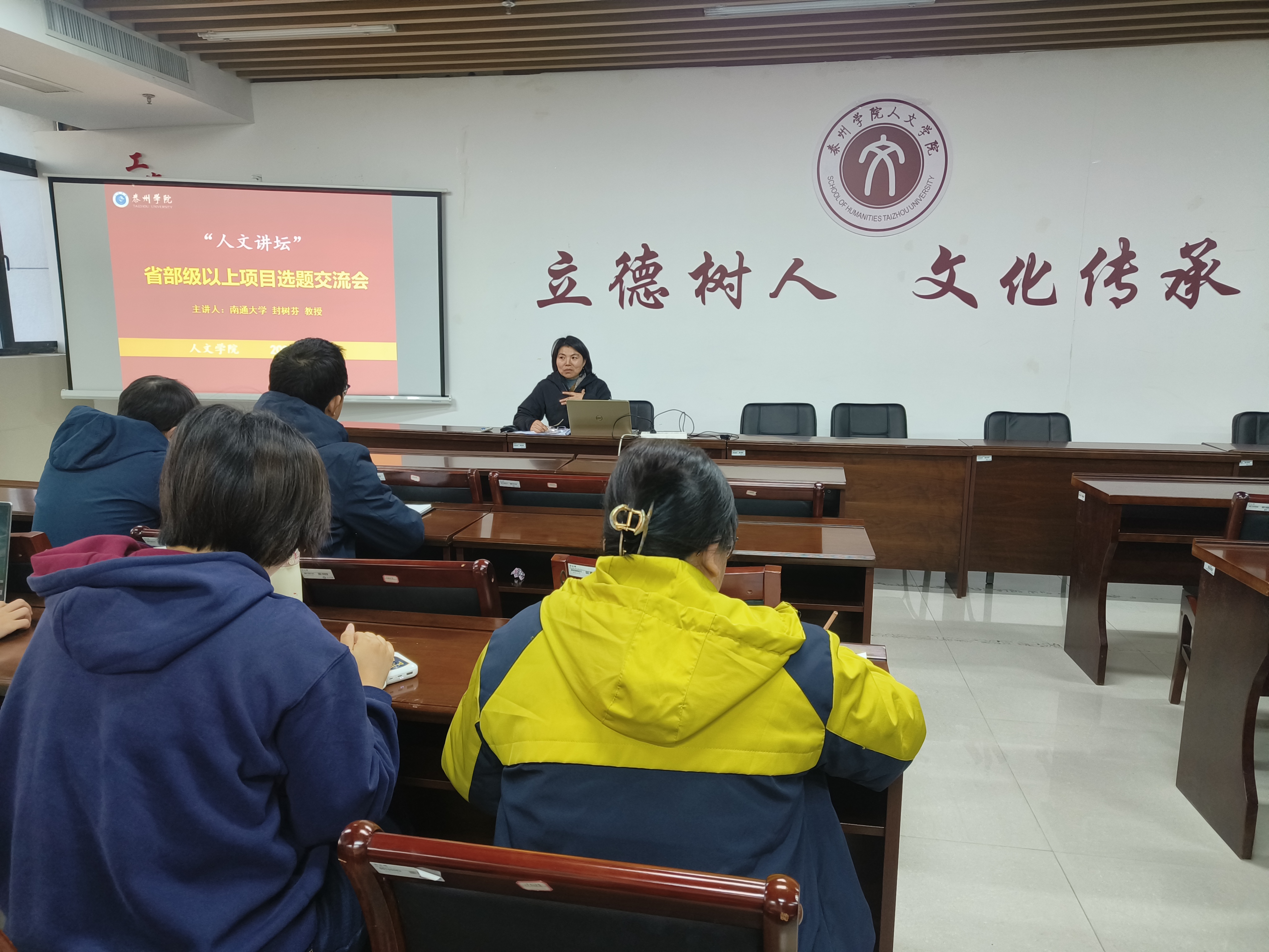 11月19日下午,南通大学文学院封树芬教授应邀莅临我院,于行政楼D2401会议室为我院教师作了“省部级以上项目选题交流会”的专题指导。会议由院长钱成教授主持,我院骨干教师代表参会。