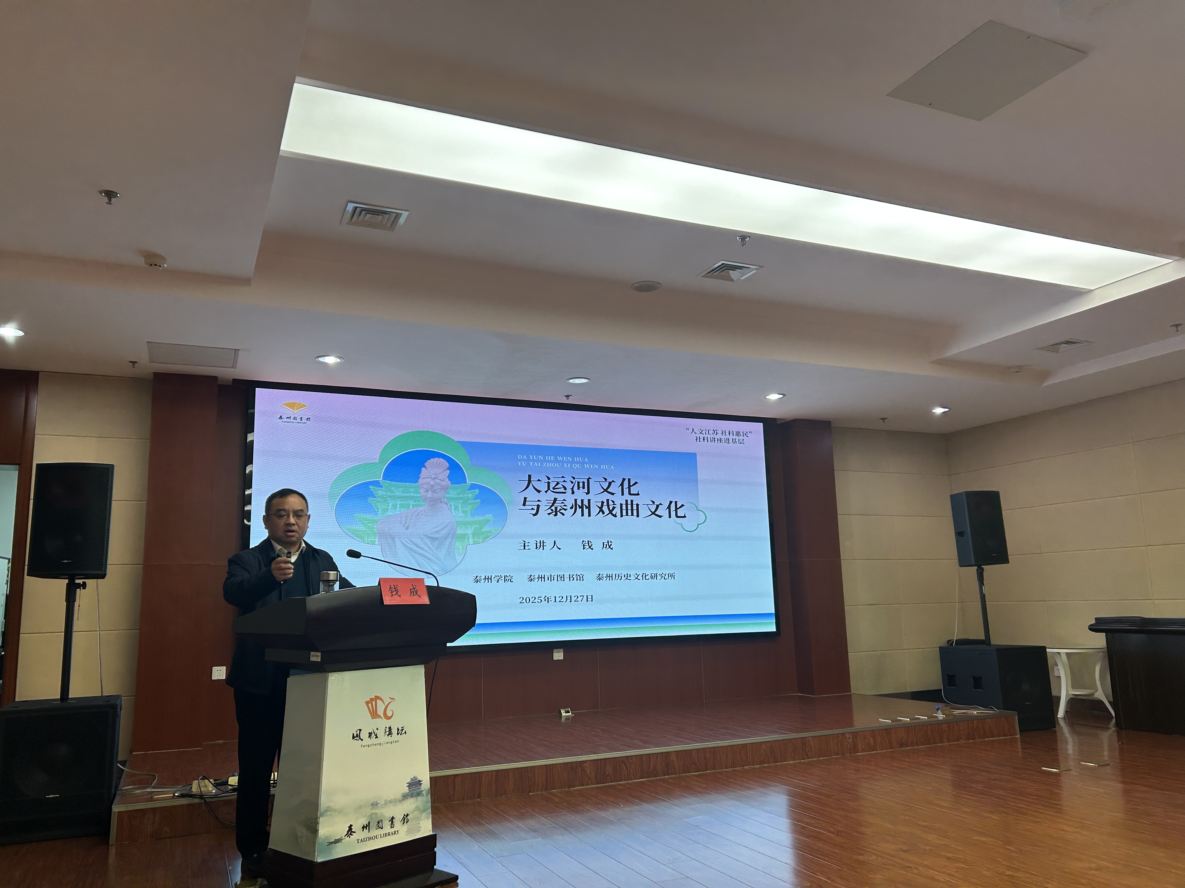 12月27日下午,由江苏省社科联主办、太阳集团tyc539、泰州图书馆、泰州历史文化研究所学院承办的“人文江苏·社科惠民”社科讲座进基层活动在泰州图书馆三楼会议室举行。我院院长、泰州历史文化研究所所长、博士生导师钱成教授受邀作《大运河文化与泰州戏曲文化》专题讲座,市文联和市作协相关领导,我校、南师大太阳集团tyc539、泰职院师生代表和来自全市各界的听众近百人参加活动。