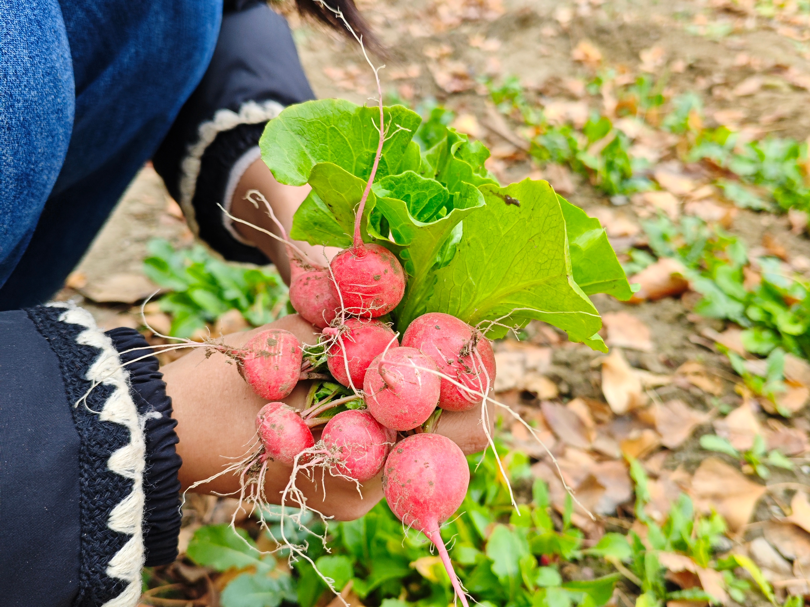 活动现场,同学们有序分组、俯身田间,亲手将一垄垄成熟的樱桃萝卜从土壤中拔出。经过前期的精心养护,这批樱桃萝卜个头饱满、色泽鲜亮。采摘过程中,同学们不时交流比较手中萝卜的形状与成色,现场气氛热烈而有序。经过近一小时的劳作,一颗颗饱满圆润、色如红宝石的樱桃萝卜与翠绿的萝卜叶一同盛满筐。