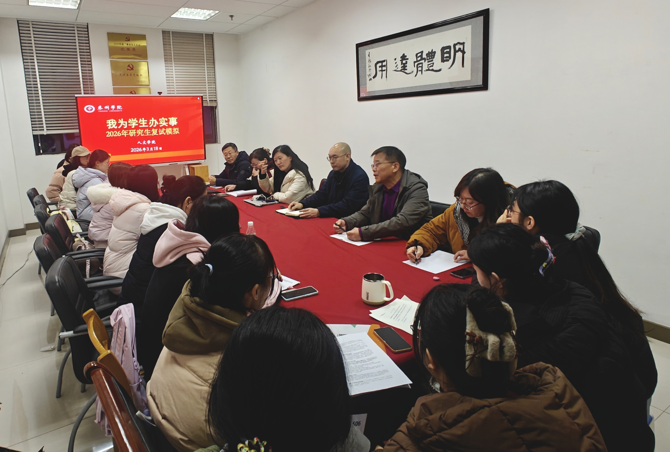 3月18日晚,我院开展 “我为学生办实事 ——2026 年研究生复试现场模拟” 活动。学院党总支书记吴小荣、副书记侯维娜及各专业考研导师担任模拟复试考官,为考生精准把脉、悉心指导。