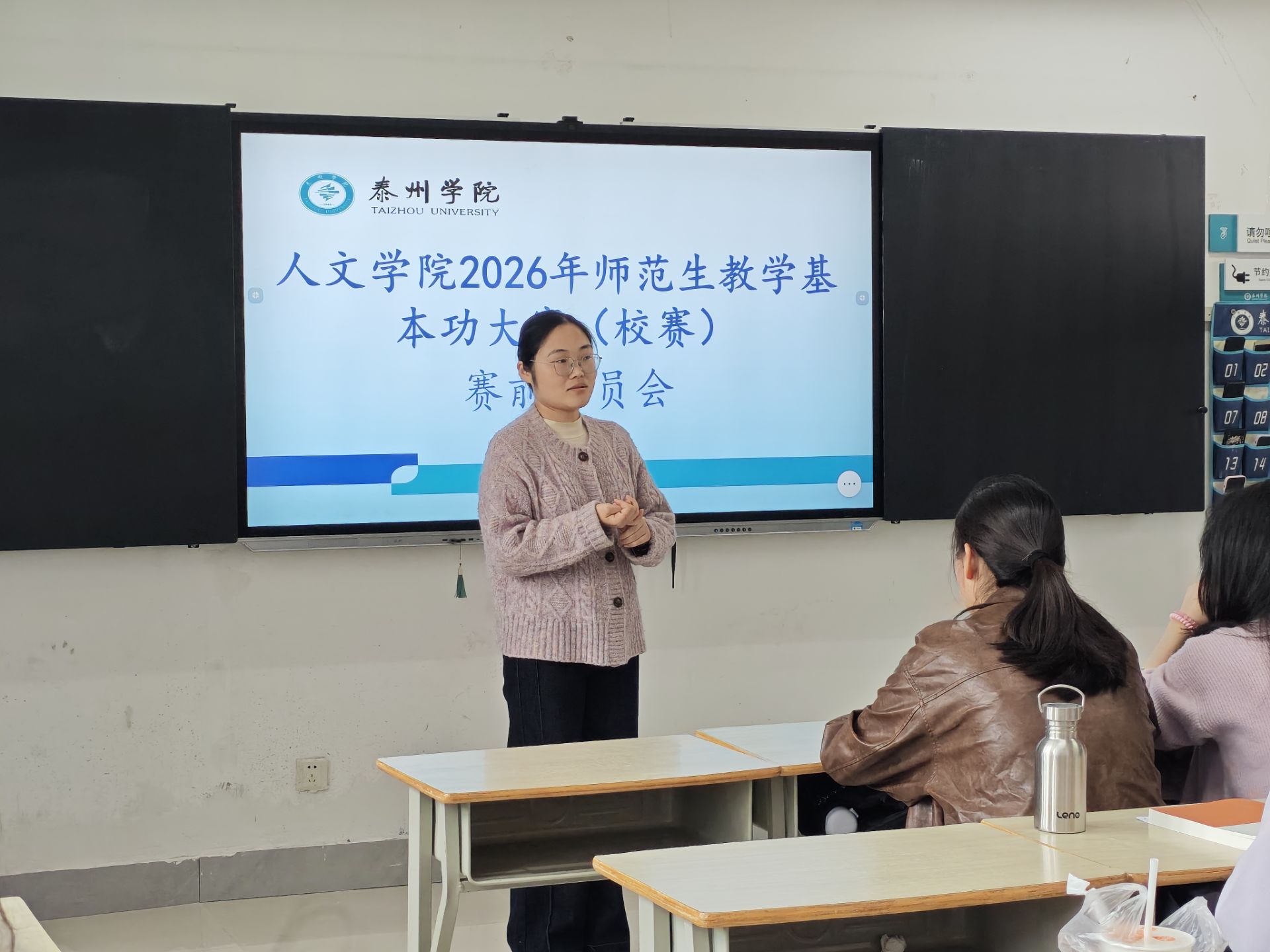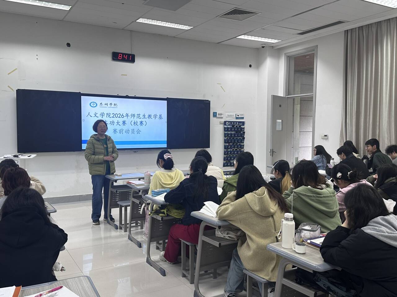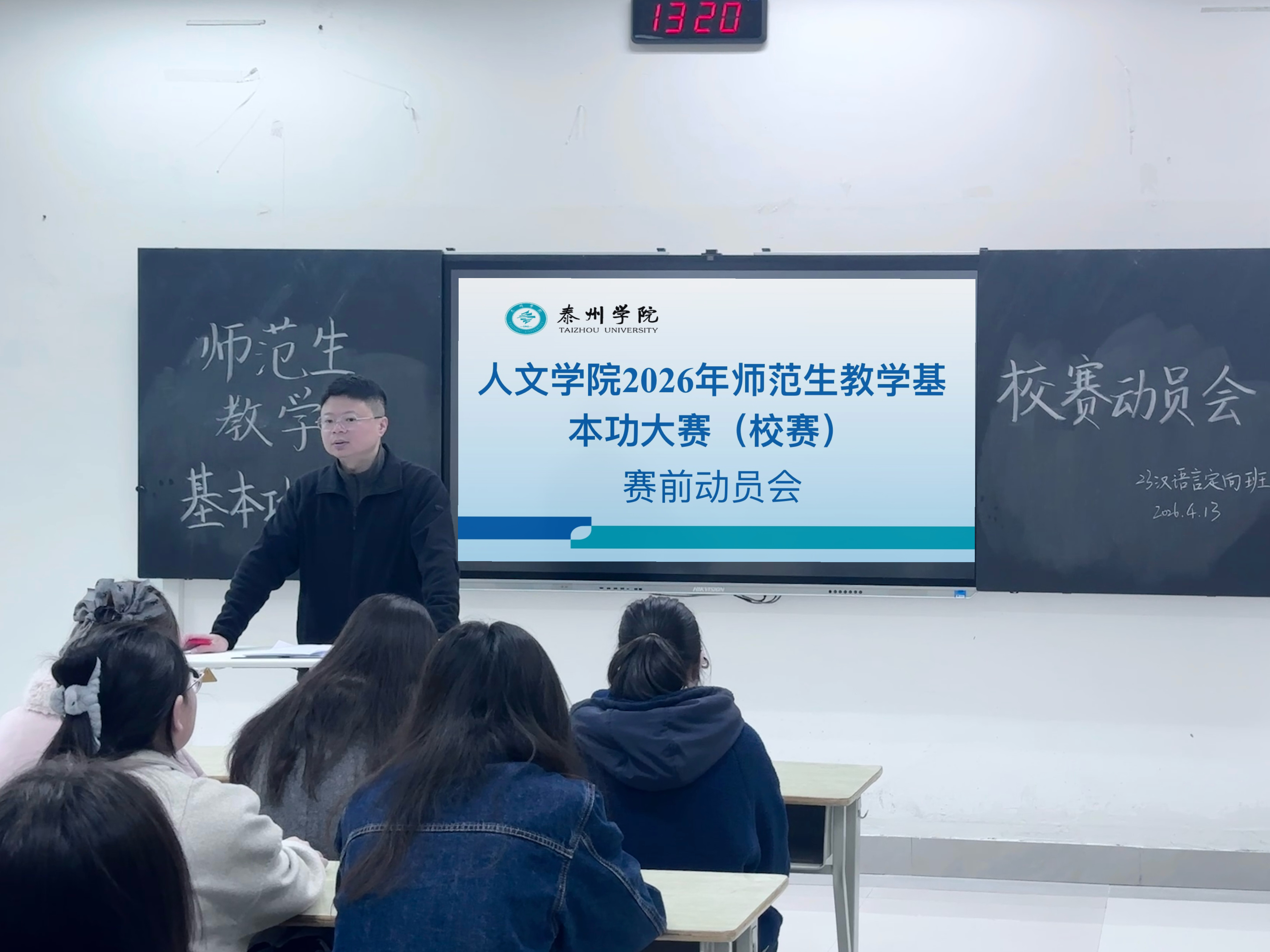 为全面提升汉语言文学(师范)专业学生的教学实践能力,切实做好第十五届江苏省师范生教学基本功大赛的备赛工作,我院决定举办2026年师范生教学基本功比赛。为确保比赛的顺利进行,2023级汉语言文学(师范)专业各班级在班主任的带领下,开展了赛前动员会。